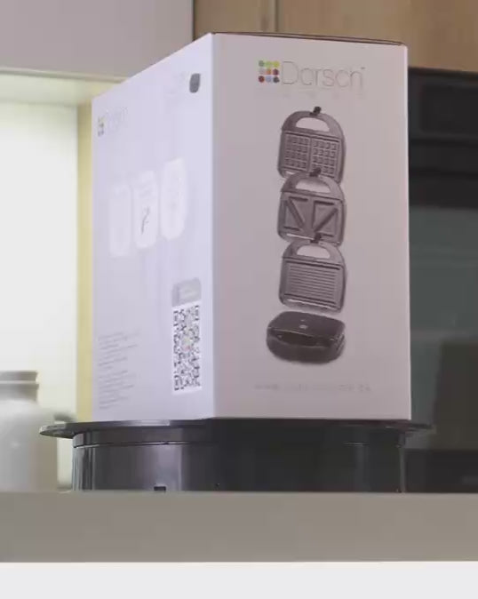 The Dorsch SM-30 Sandwich Maker is a versatile 3-in-1 kitchen appliance designed to prepare sandwiches, grill meats and vegetables, and make waffles. It features removable, non-stick plates for easy cleaning and operates at a power range of 700–800W for quick and even toasting.