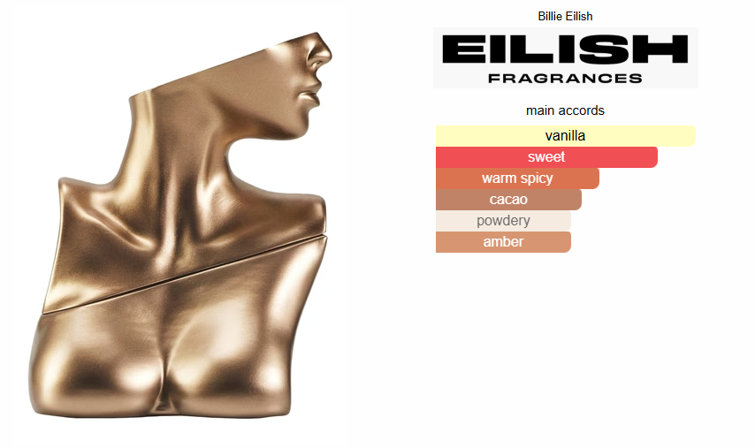 Eilish by Billie Eilish is a Oriental Vanilla fragrance for women. Eilish was launched in 2021. The nose behind this fragrance is Steve DeMercado. Top notes are Sugar, Red Berries and Mandarin Orange; middle notes are Vanilla, Cacao, Spicy Notes and Rose; base notes are Tonka Bean, Amber, Musk and Woody Notes.