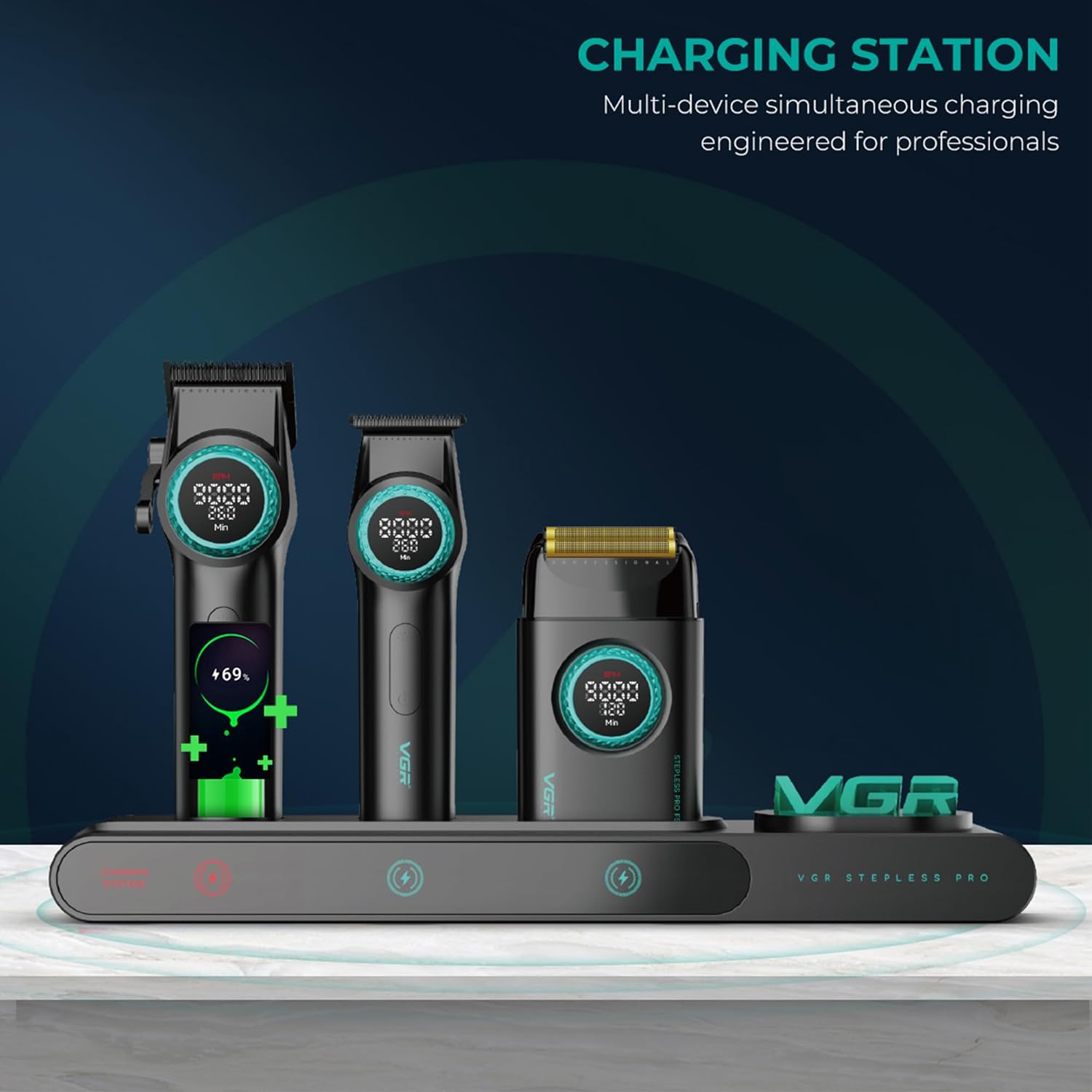 - Stylish LED-Integrated Charging Stand: The VGR Professional Barbering Set features an integrated charging stand for neatly organized tools and easy access, eliminating clutter. The stand allows simultaneous charging of the clipper, trimmer, and shaver. LED indicators display real-time charging status, ensuring a clear overview and avoiding unexpected power outages. Whether you're cutting hair at home or in a professional barbershop, this set keeps your space tidy and efficient