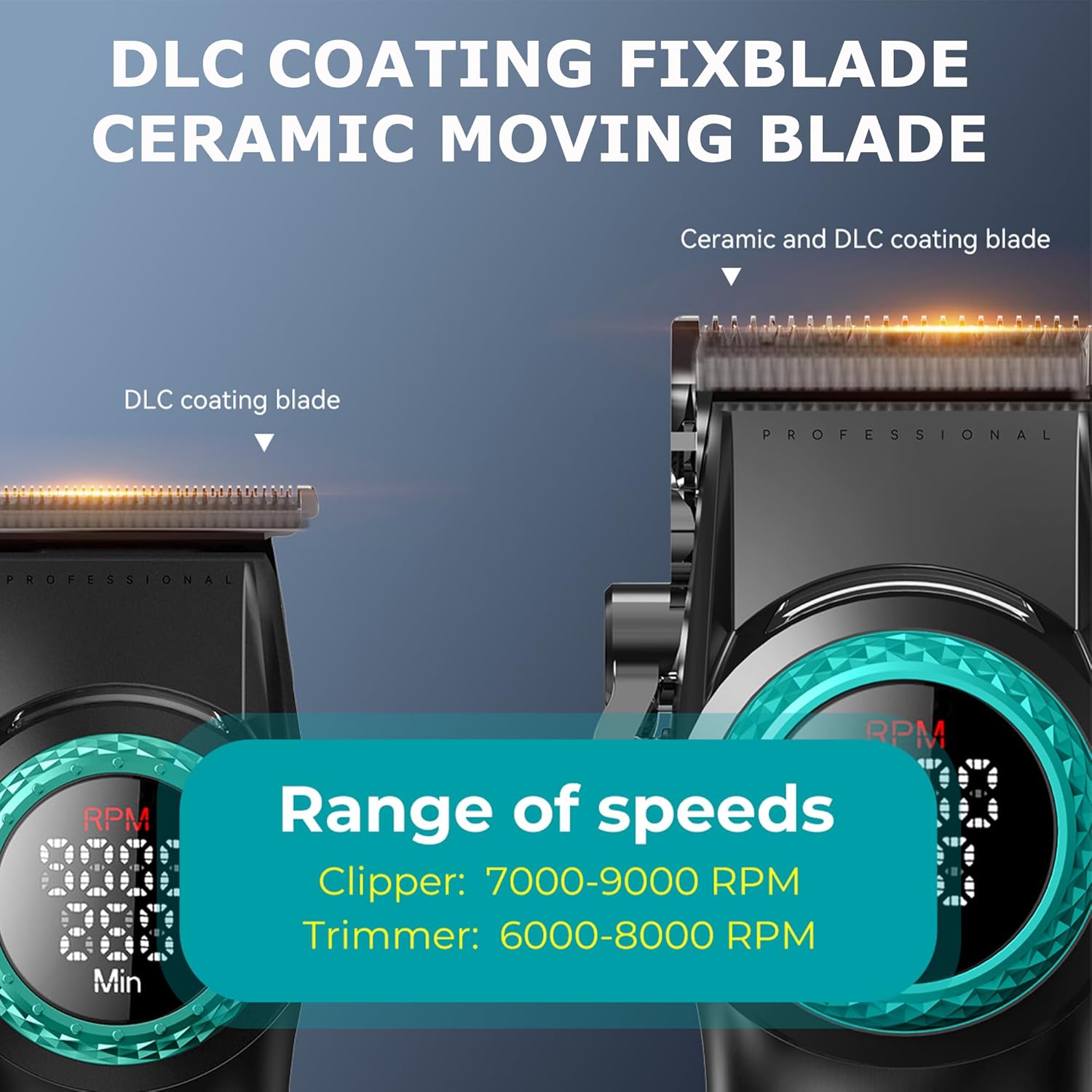 - High-Performance Professional Trimmer: This VGR 977 men's hair trimmer features ceramic and DLC-coated blades for a smooth, precise trim. It offers 21 speed settings from 6000-8000 RPM, adjustable in 100 RPM steps, ideal for beards, sideburns, and detail work. The 2500mAh battery delivers 260-300 minutes of runtime after a 1.5-hour charge. An LED spotlight improves visibility in low light, while the non-slip rubber handle ensures a stable, comfortable grip