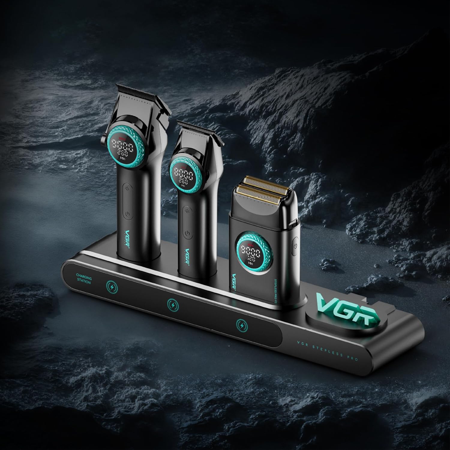 VGR 3 in 1 Professional Barber Clippers Set of Hair Clipper Trimmer Foil Shaver, Cordless Haircut Kit with Upgraded Powerful Motor, Integrated Charging Station, LED Display, Storage Box, Black